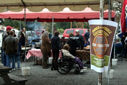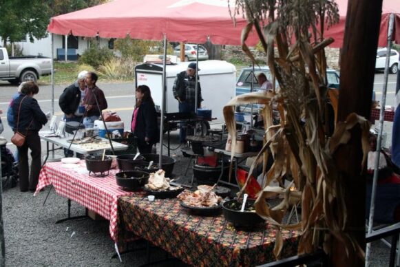 If you weren’t able to make it down yesterday, you missed a great time! More than 150 people gathered to enjoy a Thanksgiving Feast (featuring a turducken!) prepared by the Rogue Valley Dutch Oven Cookers, taste wine from La Brasseurre Vineyard, and sample goodies from Sue’s Pepper Sensation. Yummy!