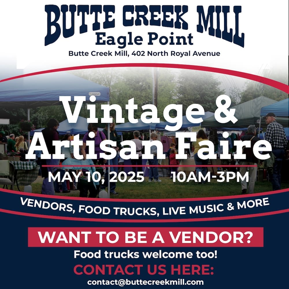 Butte Creek Mill 402 N. Royal Ave, Eagle Point, OR, United StatesAll Vendor Spaces Sold Out! Join the waitlist below for a chance to secure a space. Celebrate in true Eagle Point style at the 2025 Vintage Faire, hosted by Butte…